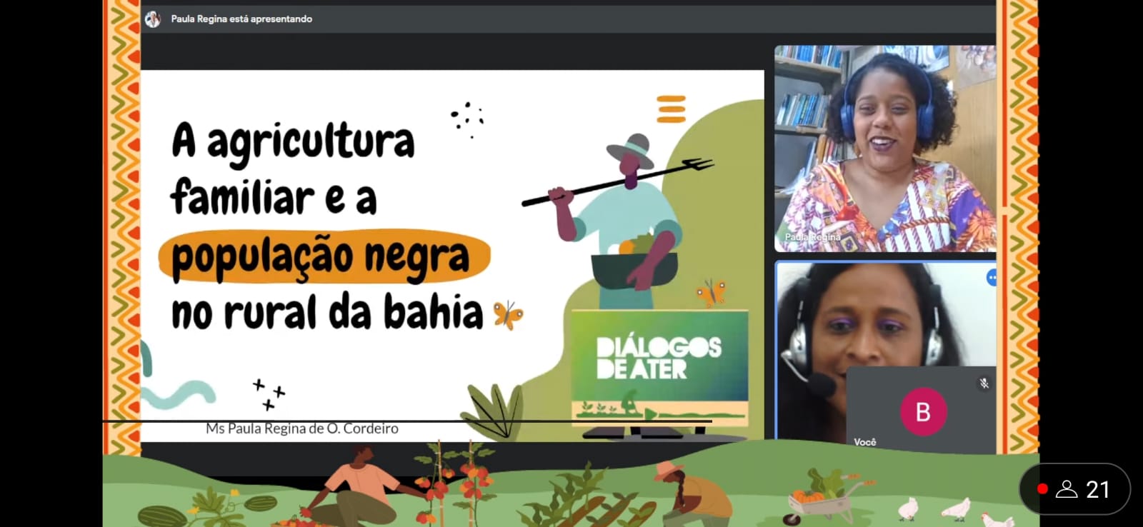O Diálogos de Ater, iniciativa da Secretaria de Desenvolvimento Rural (SDR), por meio da Superintendência Baiana de Assistência Técnica e Extensão Rural (Bahiater) e da Coordenação de Pesquisa, Inovação e Extensão Tecnológica (Cepex), voltou a ser realizado nesta quinta-feira (17), pelo canal SDRBahia, no YouTube. Com a temática: A Agricultura Familiar e a População Negra no Rural da Bahia, o encontro contou com apresentação da professora e pesquisadora Paula Regina Cordeiro, da Universidade do Estado da Bahia (UNEB) e participação do superintendente da Bahiater, Lanns Almeida.