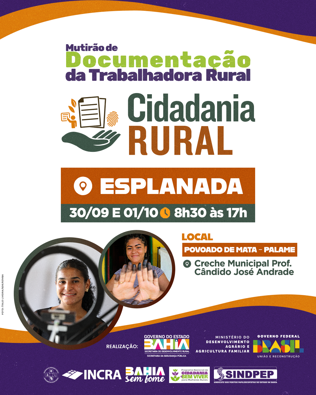 Em Esplanada, o mutirão será realizado nos dias 30/09 e 01/10, no Povoado de Mata Palame, na Creche Municipal Prof. Cândido José Andrade. Já em Conde, a ação acontece nos dias 02 e 03 de outubro, na Comunidade Sempre Viva, na Associação de Moradores, Pescadores e Marisqueiros de Sempre Viva. O atendimento em ambos os municípios será das 8h30 às 17h.