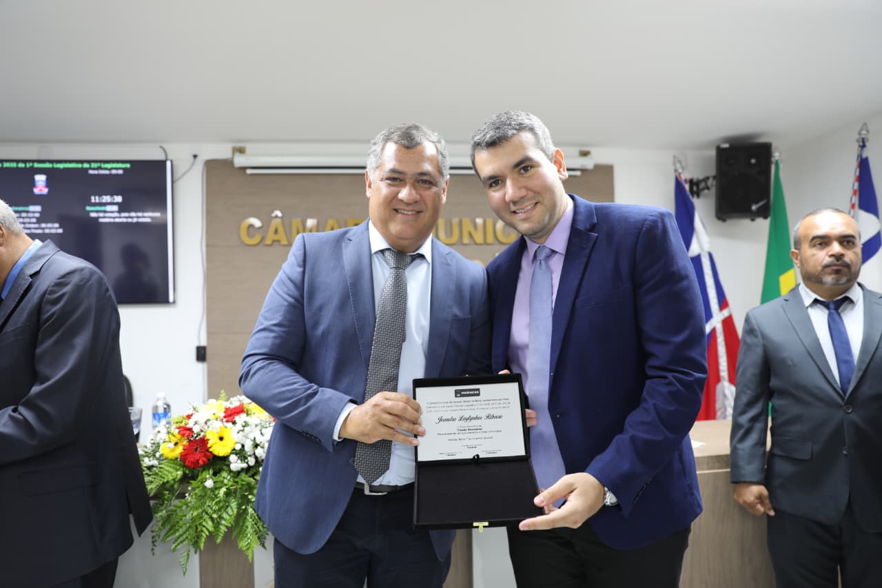O título, fruto de projeto de Decreto Legislativo subscrito pelo vereador Renê Almeida, foi entregue pelo presidente da Câmara, Jonas Bernardo de Amorim. Renê Almeida destacou que a homenagem nasceu do reconhecimento pelos relevantes serviços prestados por Jeandro à comunidade. “Jeandro, em sua função de diretor-presidente da CAR, tem contribuído significativamente para o desenvolvimento de nosso município, com especial atenção à esfera rural. Sua atuação transcende o mero cumprimento de suas atribuições, ele nos apresenta ideias inovadoras, propõe projetos e estabelece um diálogo profícuo com o município sobre as nossas inúmeras potencialidades, permitindo-nos vislumbrar aspectos que, por vezes, nós mesmos não havíamos percebido. Portanto, este título é mais do que merecido.”