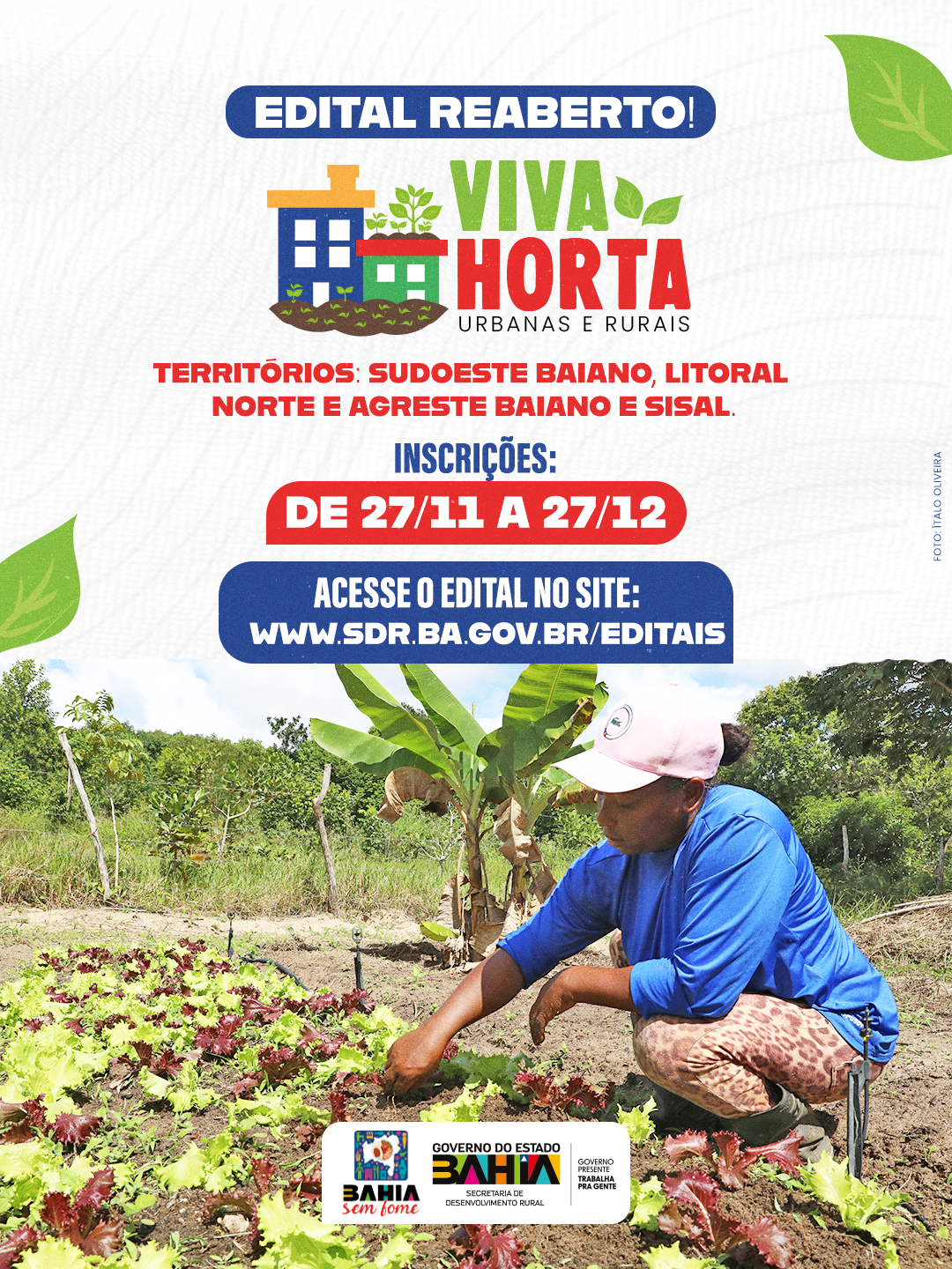 O Governo da Bahia, por meio da Secretaria de Desenvolvimento Rural (SDR), reabriu a seleção do projeto Viva Horta, com o objetivo de ampliar a cobertura da iniciativa nos territórios Sudoeste Baiano, Litoral Norte e Agreste Baiano e Sisal. Coordenado pela Superintendência de Agricultura Familiar (SUAF), o edital busca selecionar Organizações da Sociedade Civil (OSC) para atuar na implementação e no fortalecimento de hortas comunitárias.
