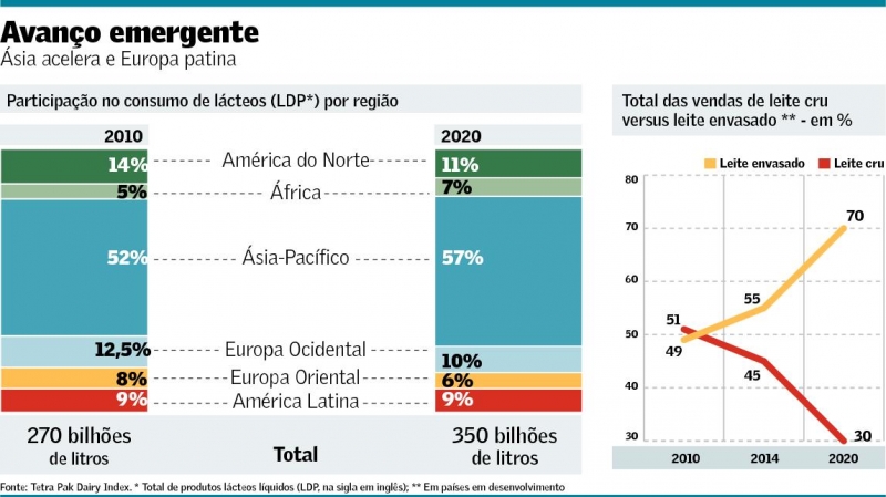 A projeção é que o consumo dos chamados LDP (do inglês liquid dairy products) saia de 270 bilhões de litros no ano que passou para 350 bilhões de litros em 2020. "Esse aumento deve ocorrer graças ao crescimento econômico nos mercados emergentes, especialmente a Ásia", disse Dennis Jönsson, CEO e presidente do grupo Tetra Pak, em teleconferência com jornalistas.