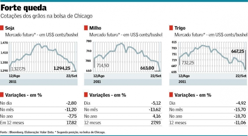 Em meio ao recrudescimento das preocupações com a crise econômica global, as commodities agrícolas acentuaram seu ritmo de queda e atingiram novas mínimas nas bolsas americanas na quinta-feira. Em Chicago, os contratos futuros de segunda posição de entrega (normalmente os de maior liquidez) do milho sofreram o maior tombo em quase um ano. Em Nova York, o açúcar atingiu mínimas em três meses. O cacau despencou ao menor nível em mais de um ano, e o café praticamente zerou os ganhos que tinha em 2011.