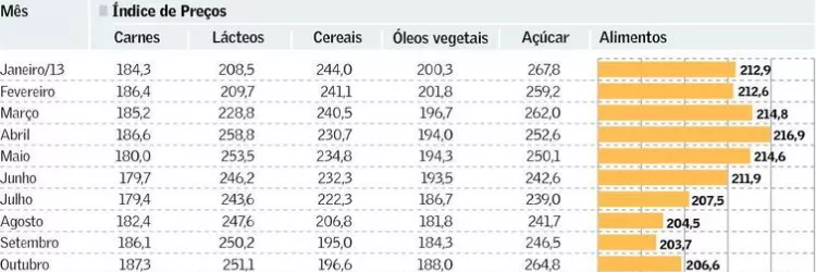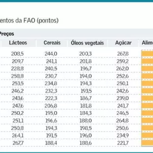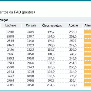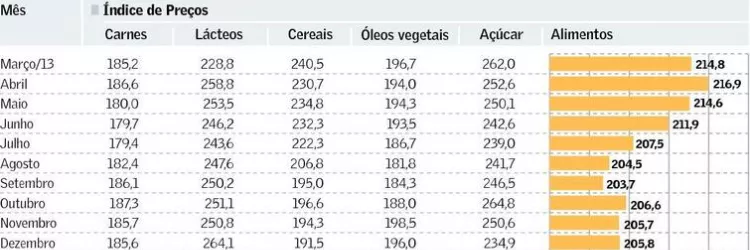 O índice de preços de alimentos da FAO, formado por cesta de commodities como trigo, milho, arroz, açúcar, carne e óleo vegetal, subiu 15% em relação ao ano passado. O índice saltou quase 150% na última década.