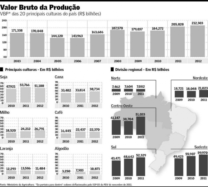 O valor bruto da produção (VBP) das 20 principais culturas agrícolas do país deverá alcançar R$ 212,3 bilhões em 2012, segundo projeção divulgada ontem pelo Ministério da Agricultura. O valor é quase R$ 2 bilhões mais baixo que o previsto em novembro, mas, se confirmado, ainda será 3,1% superior ao previsto pela Pasta para este ano (R$ 205,8 bilhões) e significará um novo recorde histórico.