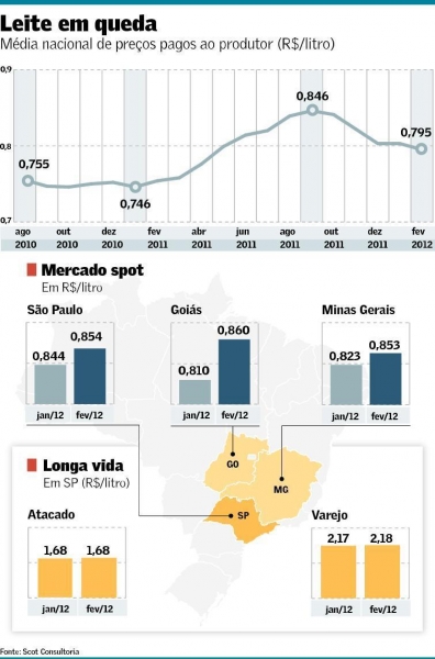 No mercado spot, aquele comercializado entre empresas, a média do pagamento pelo litro de leite foi de R$ 0,82, em janeiro, e R$ 0,85, em fevereiro deste ano, para São Paulo, Minas Gerais e Goiás. Em São Paulo, o preço do longa vida (UHT) manteve-se estável em R$ 1,68 no atacado entre os meses de janeiro e fevereiro; no varejo, ficou em R$ 2,17 e R$ 2,18, respectivamente.
