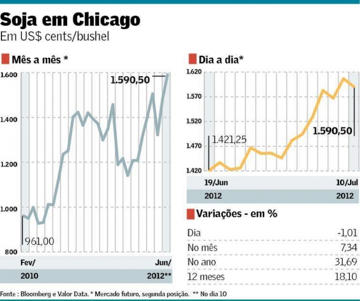 A disparada das cotações internacionais da soja nas últimas semanas, após meses de negociações em patamares já elevados, deverá estimular a ampliação da área plantada com a oleaginosa no país e garantir margens polpudas aos produtores brasileiros na safra 2012/13. Carro-chefe do agronegócio nacional há mais de uma década, a soja poderá, assim, retomar a dianteira na colheita de grãos e fortalecer sua liderança no valor bruto da produção (VBP) agrícola e nas exportações do setor.