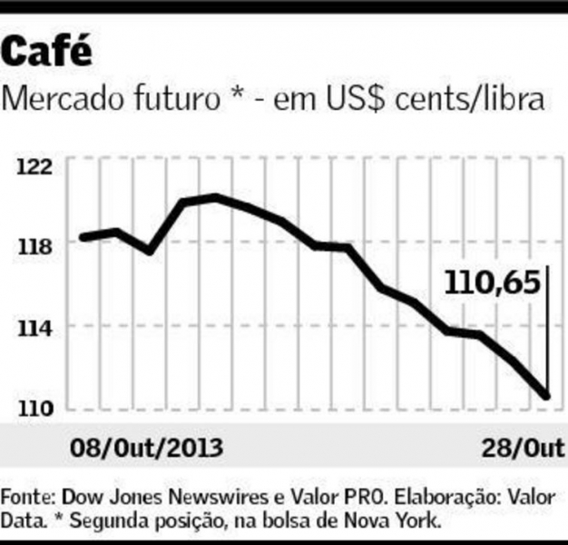 Os preços do café arábica na bolsa de Nova York voltaram a recuar ontem ao menor patamar em quatro anos e meio, pressionados pelo início da safra do grão na Colômbia e nos países da América Central. Os contratos com vencimento em março de 2014 registraram queda de 165 pontos, a US$ 1,1065 por libra-peso, a menor cotação desde março de 2009. A ampla colheita no Brasil, maior fornecedor mundial da commodity, também contribui para puxar as cotações para baixo. A Conab estima safra de 47,5 milhões de sacas de 60 quilos em 2013/14 no país, volume recorde para ano de bienalidade negativa. No mercado interno, o café de boa qualidade é negociado por R$ 260 a R$ 265 a saca de 60,5 quilos, de acordo com informações do Escritório Carvalhaes, de Santos.