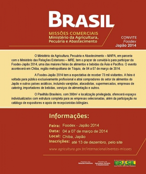 18/11/2013 Foodex Ministério da Agricultura - FOODEX 2014 Tags japao Galeria: Notícias Relacionadas Exportações brasileiras para o Japão crescem 55,7% no primeiro trimestre Exportações brasileiras para o Japão crescem 55,7% no primeiro trimestre
