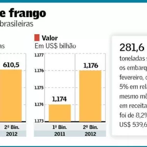 Os embarques de outras aves, como patos, gansos e marrecos, cujos volumes são bem mais modestos, também recuaram de forma significativa. Foram 1,168 mil toneladas entre janeiro e outubro deste ano, uma redução de 55,2% em relação ao mesmo período de 2012. Em receita, a queda foi ainda maior - de 59%, para US$ 4,250 milhões.