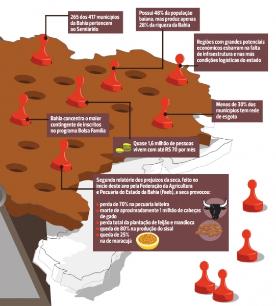 Se quisesse decretar independência do restante do estado, o Semiárido baiano dividiria a Bahia em duas partes. Levaria na esteira 265 dos 417 municípios, quase 6,7 milhões dos baianos - o equivalente a 48% da população - e, no entanto, bem menos de um terço da riqueza produzida pelo estado (apenas 28%). Ao final da batalha, não sobraria mais do que um gigante pobre.