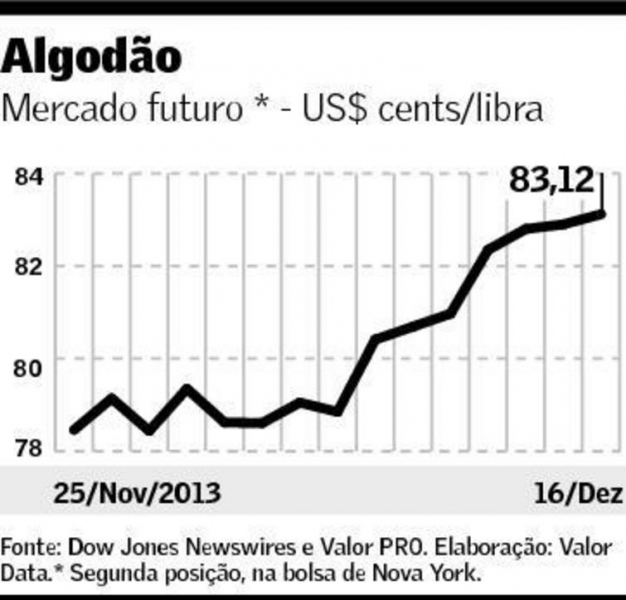 A queda das importações chinesas de algodão manteve os preços da pluma em baixa durante a maior parte da sessão de ontem em Nova York, mas as cotações reagiram e emplacaram o quinto pregão seguido de alta. Os papéis para maio encerraram com avanço de 0,27% (22 pontos), a 83,12 centavos de dólar por libra-peso. Em novembro, a China importou 173,1 mil toneladas de algodão, e no acumulado dos 11 meses de 2013, 3,54 milhões de toneladas. Os volumes são menores que os do ano passado em 43% e 23,1%, respectivamente. Porém, a expectativa de produção global menor faz com que os preços sigam no maior patamar em dois meses. No oeste da Bahia, a arroba da pluma foi negociada a R$ 69,77, segundo a Associação de Agricultores e Irrigantes da Bahia (Aiba).