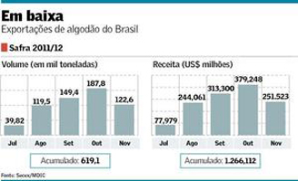 Entre julho e novembro foram embarcadas pelo país 302 mil toneladas de algodão em pluma, o que rendeu uma receita de US$ 578 milhões, de acordo com a Anea. No mesmo período do ano passado, haviam sido exportadas mais que o dobro - 619 mil toneladas - com uma receita de US$ 1,266 bilhão.