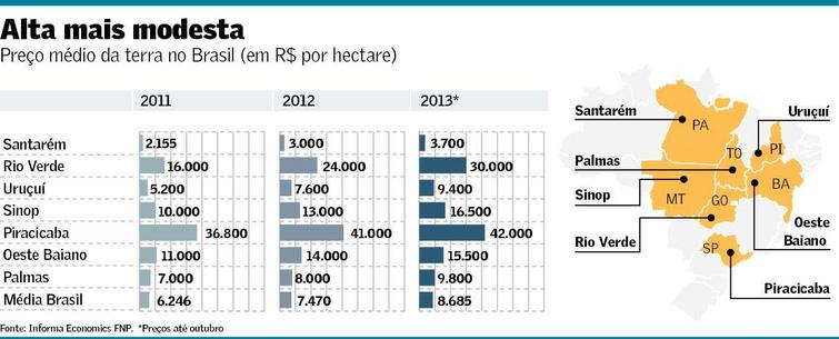 Como reflexo do menor volume de negócios, a alta nos preços das terras no Brasil arrefeceu em 2013 em algumas regiões, como no Oeste da Bahia e nas regiões canavieiras de São Paulo (ver texto ao lado). Para Ferraz, este deve ser mais um ano de poucos negócios no segmento empresarial.