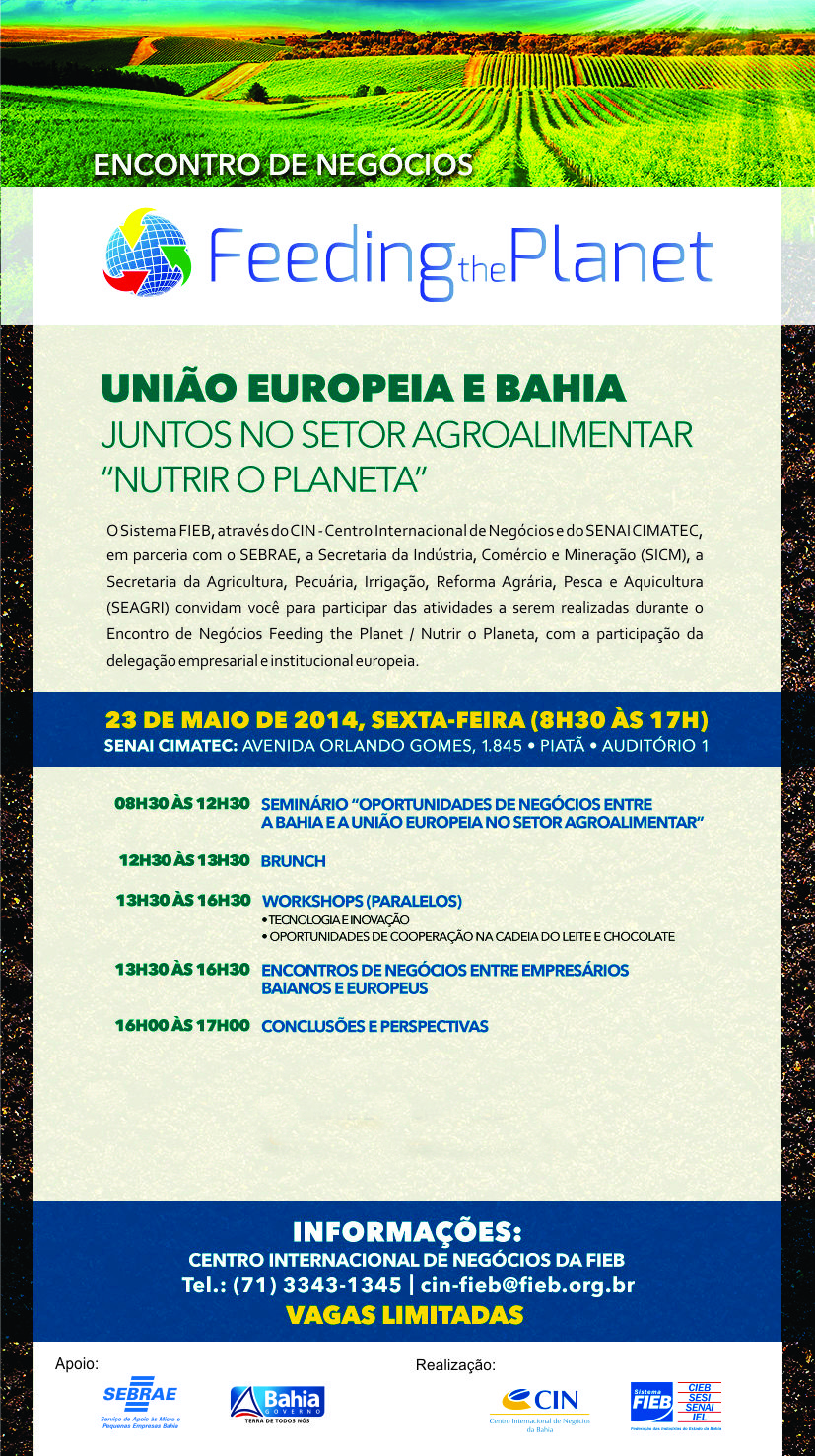 O Sistema FIEB, através do CIN - Centro Internacional de Negócios e do SENAI CIMATEC, em parceria com o SEBRAE, Secretaria da Indústria Comércio e Mineração (SICM), Secretaria da Agricultura, Pecuária, Irrigação, Reforma Agrária, Pesca e Aquicultura (SEAGRI) e Serviço Nacional de Aprendizagem Rural (SENAR) convidam você para participar das atividades a serem realizadas durante o Encontro de Negócios Feeding The Planet / Nutrir o Planeta, com a participação de delegação empresarial e institucional europeia.