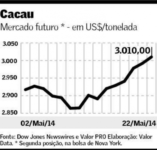 Acima dos US$ 3 mil Os preços do cacau voltaram a subir ontem na bolsa de Nova York e superaram a "barreira psicológica" dos US$ 3 mil a tonelada, embora não tenham surgido novidades no lado dos fundamentos do mercado. Os contratos para setembro fecharam em alta de US$ 18, a US$ 3.010 a tonelada. O mercado tem se recuperado de um período de quedas, provocado por recentes chuvas no oeste da África, que concentra dois terços da produção global de cacau. Porém, continua no radar dos traders a previsão de déficit de oferta para esta safra (2013/14), o que tem motivado os fundos a voltarem a apostar na sustentação dos contratos futuros. No mercado interno, a arroba negociada em Ilhéus e Itabuna manteve-se entre R$ 100 e R$ 104, de acordo com a Central Nacional de Produtores de Cacau.