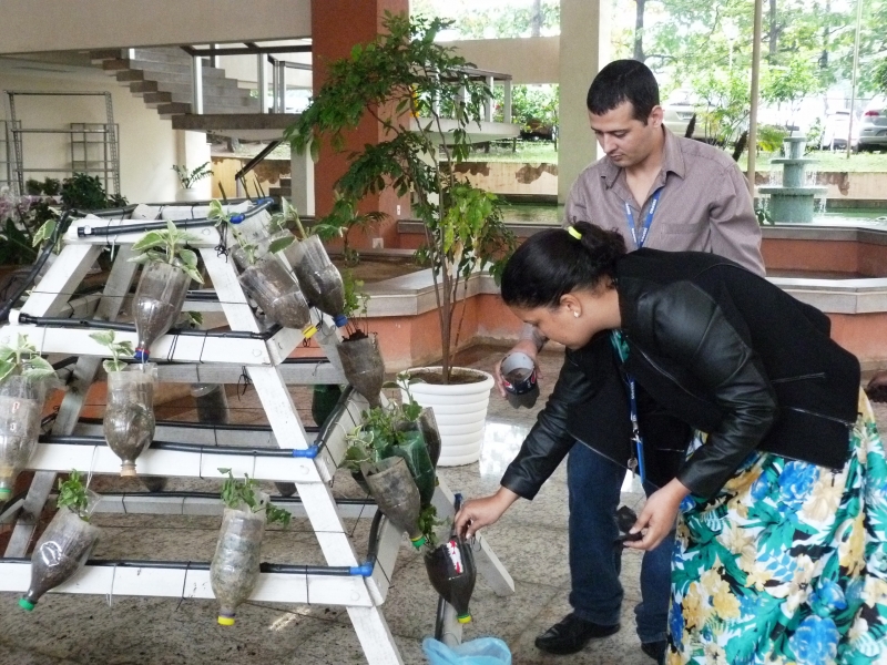 Oficina - No momento reservado para a parte prática os participantes aprenderam a construir uma horta vertical usando garrafas pet. De acordo com Hélio Saulo Arandas, este tipo de horta é ideal para ser instalada em quintais e varandas de apartamentos. Este é o caso da enfermeira do trabalho, Daniela Rocha: “sempre tive vontade de implantar uma horta em meu apartamento; agora já sei como fazer”.