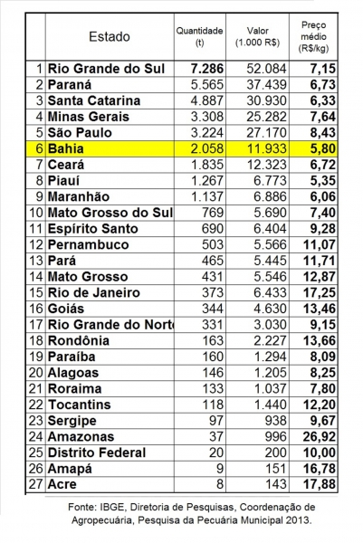 No ano de 2013 a região Sul aportou 50% da produção nacional, enquanto que as regiões Sudeste e Nordeste contribuiram com 21% cada.