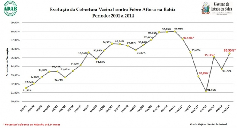 A segunda etapa da campanha de vacinação contra a Febre Aftosa realizada em novembro de 2014 alcançou os melhores resultados dos últimos dois anos, com o índice de 95,50%, superior aos 95,12% obtidos em novembro de 2013, e 92,89% de novembro de 2012. O resultado foi divulgado nesta terça-feira (21) pela Agência de Defesa Agropecuária da Bahia (Adab), vinculada à Secretaria de Agricultura (Seagri). Na segunda etapa da campanha são vacinados apenas os animais com até 24 meses. De acordo com o levantamento da Adab, os criadores vacinaram 3.340.753 dos 3.498.301 bovinos e bubalinos jovens, com idade de até dois anos, garantindo a sanidade do rebanho baiano.