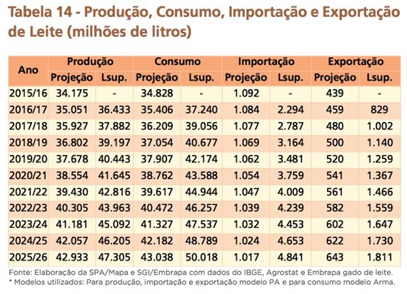 A produção de leite deverá crescer nos próximos 10 anos a uma taxa anual entre 2,3 e 3,1%. Essas taxas correspondem a passar de uma produção de 34,2 bilhões de litros em 2016 para valores entre 42,9 e 47,3 bilhões de litros no final do período das projeções. O consumo nos próximos anos deve estar próximo da produção, estando estimado crescer anualmente a taxa de 2,2% ao ano durante o período das projeções. Mas pode chegar a 3,5%.