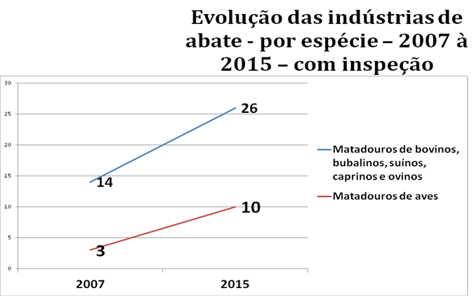 O parque industrial do Estado apresentou uma evolução no número de plantas frigoríficas registradas no Serviço de Inspeção Estadual com um crescimento de 23,81% passando de 21 para 26 matadouros frigoríficos no período de 2009 a 2016. Entretanto, em 2016, comparando com igual período de 2015 pode-se observar uma redução de 24,32 % do abate de bovinos, tendência observada para todas as espécies de animais de açougue (suínos e pequenos ruminantes), reflexo do contexto macro econômico que provocou uma redução das atividades industriais, dentre outros fatores.