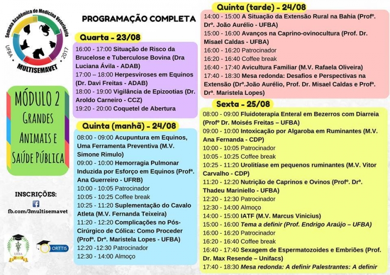 Serão realizadas palestras no dia 23/08, a partir das 16h, discorrendo "Situação de risco da brucelose e tuberculose bovina na Bahia", ministrado pela Dra. Luciana Niedersberg de Ávila (coordenadora estadual do programa de controle e erradicação da brucelose e tuberculose bovina na Bahia - ADAB) e, às 17h, apresentando "Herpeviroses em equinos", ministrada pelo Dr. Davi Freitas (coordenador do programa estadual de sanidade equídea - ADAB).