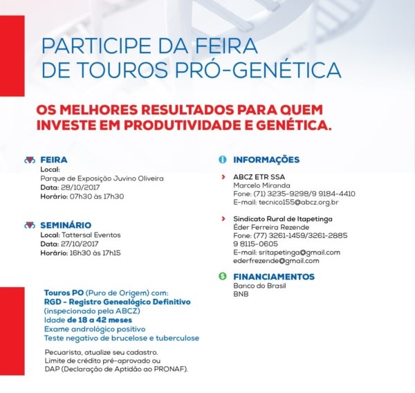 Com o objetivo de estimular o aumento da produção de carne e leite de qualidade nas propriedades rurais, a ABCZ, promove FEIRA DO PRÓ-GENÉTICA EM ITAPETINGA dia 28, sábado, durante a VI Semana do Homem do Campo que ocorrerá no período de 23 a 29 do corrente mês. A feira abordará uso de touros zebuínos puros de Origem (PO), com Registro Genealógico Definitivo (RGD) e Exame Andrológico apto à reprodução, com idade entre 18 a 42 meses, o melhoramento genético no Brasil através de monta natural, e suas  expansões.