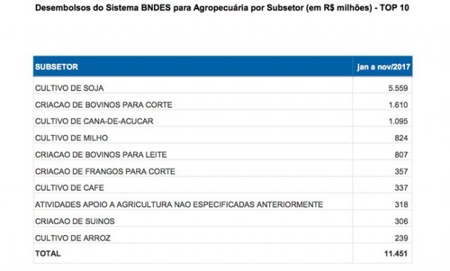 De acordo com dados levantados pelo BNDES a pedido da SNA, os financiamentos para o cultivo de soja lideraram o ranking das liberações, respondendo por R$ 5,5 bilhões. Em seguida estão os financiamentos concedidos a bovinos para corte (R$ 1,6 bilhão) e cultivo de cana-de-açúcar (R$ 1 bilhão).