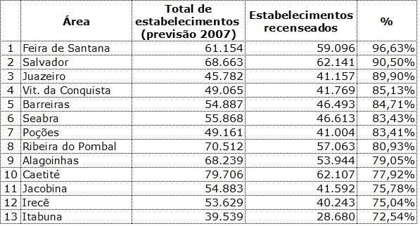 Esse desempenho está bem próximo à média nacional (82,06% dos cerca de 5,2 milhões de estabelecimentos já foram recenseados) e coloca a Bahia em 17º lugar entre os 27 estados.