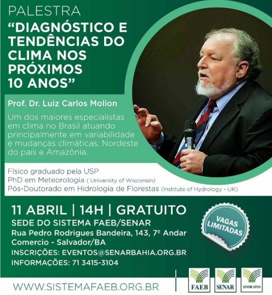 O professor fará uma palestra gratuita na sede do Sistema FAEB/SENAR, no bairro do Comércio, em Salvador, no próximo dia 11 de abril, às 14h. O tema é: "Diagnóstico e Tendências do Clima nos próximos 10 Anos". As inscrições são limitadas e devem ser feitas através do e-mail:eventos@senarbahia.org.br.