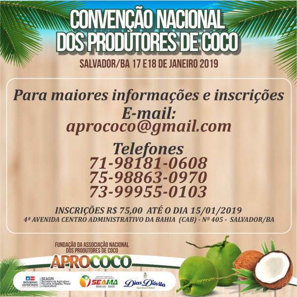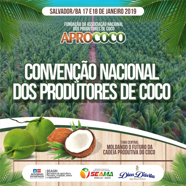 O evento culminará com a fundação da APROCOCO – Associação Nacional dos Produtores de Coco, no dia 17/01/2019 às 9:00h, no Auditório da Secretaria de Agricultura do Estado da Bahia, entidade, localizada à 4ª Avenida Centro Administrativo da Bahia - Centro Administrativo da Bahia, Salvador – BA.