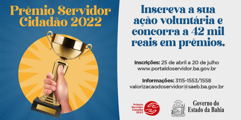 O Prêmio Servidor Cidadão está de volta, com inscrições abertas a partir desta segunda-feira (25). A premiação, que ficou suspensa nos últimos dois anos em função da pandemia da Covid-19, reconhece ações voluntárias desenvolvidas pelos servidores estaduais em toda a Bahia. Podem participar servidores ou grupo de servidores da ativa, ocupantes de cargo comissionado, contratados via Reda e Primeiro Emprego, vinculados ao Poder Executivo, Legislativo ou Judiciário, que desenvolvam no seu dia a dia ações que tenham impacto social.