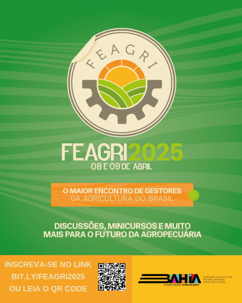 A Secretaria da Agricultura, Pecuária, Irrigação, Pesca e Aquicultura da Bahia (Seagri) realizará o V Encontro do Fórum Estadual dos Gestores Municipais da Agropecuária da Bahia (Feagri) nos dias 8 e 9 de abril, em Salvador. Este é o maior fórum focado nesse público no Brasil, reunindo gestores de todos os 27 territórios de identidade da Bahia. As inscrições podem ser feitas pelo formulário disponível no link bit.ly/feagri2025.