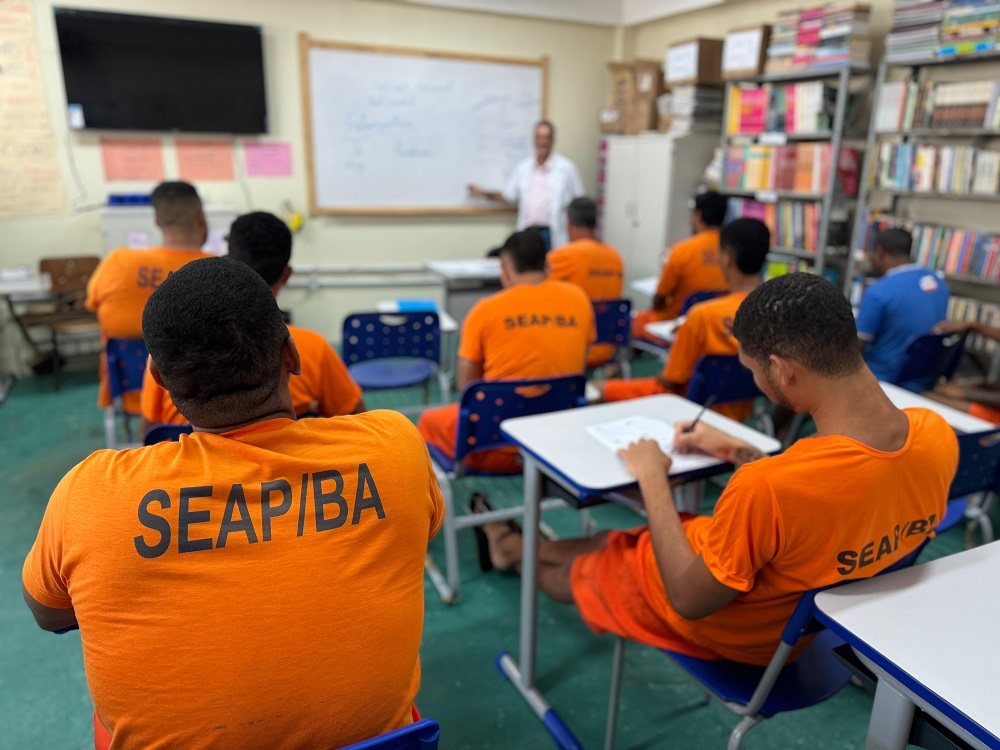 Inscritos no Exame Nacional para Certificação de Competências de Jovens e Adultos (ENCCEJA), mais de 50 internos que são alunos da Escola da Colônia Penal de Simões Filho, participaram de um "aulão" realizado nesta terça-feira (8). A unidade de ensino é uma extensão do Colégio Estadual Doutor Uberlindo Mamede de Oliveira, localizado naquele município. Os aulões tiveram início no dia 3 de outubro e vão até quarta-feira (9). Os reeducandos que irão prestar exames do Enem também serão preparados.