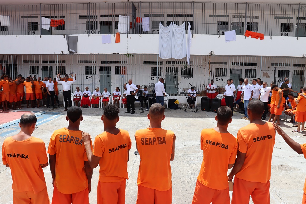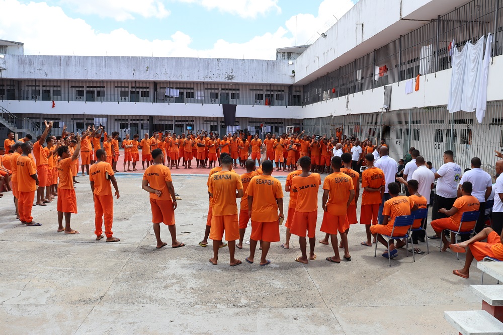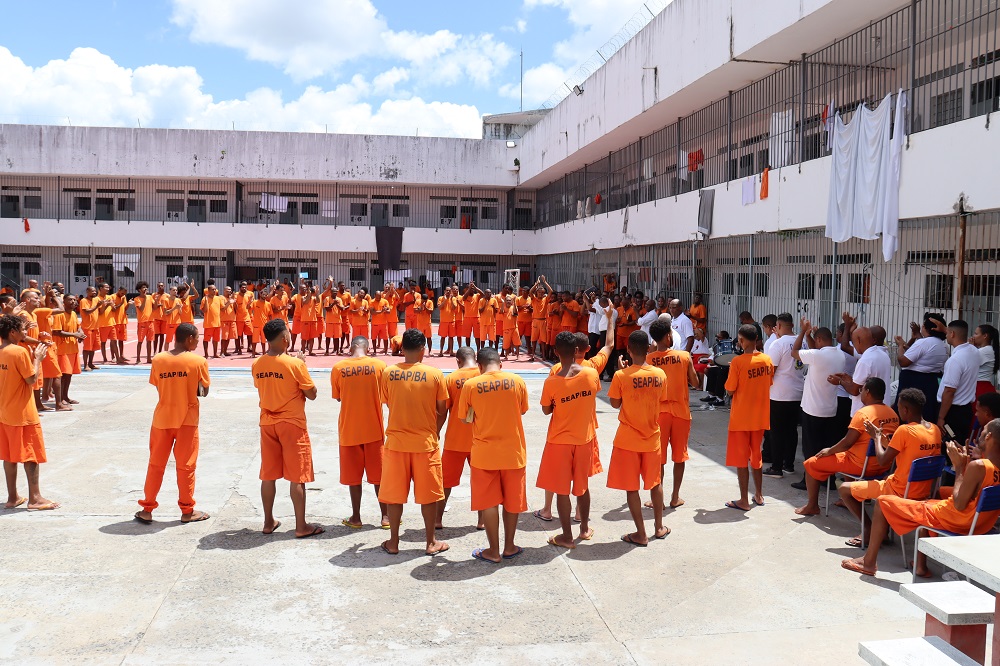 Internos do Módulo 2 da Pentenciária Lemos Brito (PLB) participaram de um culto de Ação de Graças, na manhã desta segunda-feira (24), realizado pelo Grupo Evangélico Missionários de Cristo. O momento de fé e solidariedade marcou mais uma edição da "Festa do Círculo de Oração", realizada anualmente na unidade prisional.