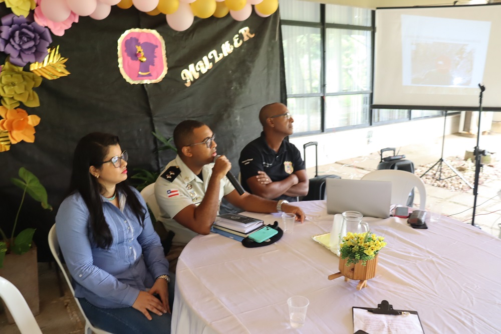 A composição da mesa contou com a presença do coordenador jurídico da CMEP, Tiago Guerra, da Coordenadora do Departamento de Direitos Humanos Comunitários da Polícia Miltar (PM), Major Janaína Caldas, do representante da Ronda Maria da Penha, Tenente Rafael Lino e da Coordenadora da Equipe Multidisciplinar da CMEP, Simone Santana, que mediou os debates e também coordenou o evento.