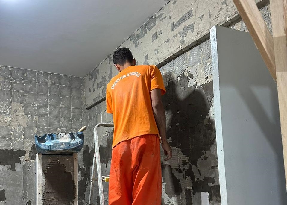 As obras de implantação do alojamento da Polícia Penal, do Conjunto de Eunápolis, seguem aceleradas. Uma sala e um banheiro já estão prontos. Agora, os internos estão finalizando os quartos e mais um banheiro. É serviço feito com alegria. As paredes velhas estão saindo de cena para entrar um reboco de cimento. A massa novinha está no ponto esperando. Dois custodiados do sistema do regime semiaberto são responsáveis pela obra. Os reeducandos terão direito à remição de um terço de sua pena, ou seja, a cada três dias de trabalho, um dia de pena é reduzido.