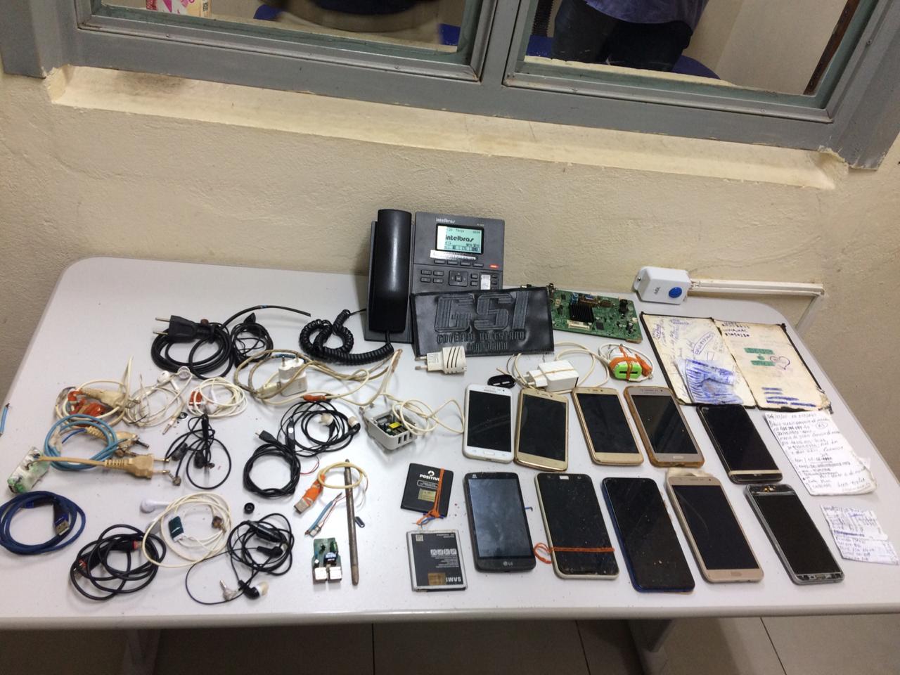 Foram encontrados os materiais ilícitos conforme a seguinte descrição:10 (dez) aparelhos celulares;02 (duas) baterias extras;05 (cinco) carregadores;06 (seis) fones de ouvido;01 (uma) faca federal;02 (dois) cabos USB
