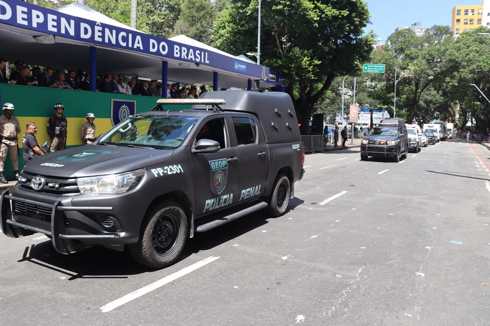 Pela primeira vez na história, a Polícia Penal participou do Desfile Cívico do sete de setembro no comboio das viaturas da forças de segurança do Estado. No grupamento motorizado que representou a corporação, diretores das unidades prisionais e os policiais penais em atuação mostraram orgulho em poder participar do ato cívico.