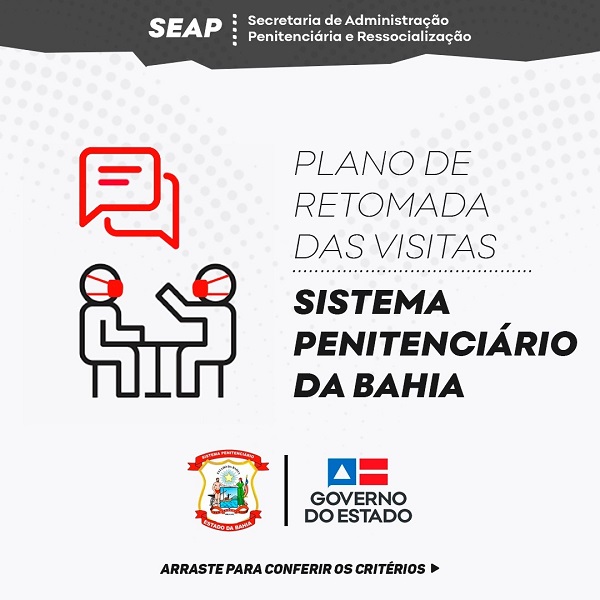 O Governo do Estado, por meio da Secretaria de Administração Penitenciária e Ressocialização (Seap), anuncia o retorno, a partir da próxima segunda-feira (19), das visitas sociais nas unidades prisionais do Estado com a implementação da 4ª Fase do Plano de Retomada das Visitas no sistema penitenciário baiano.