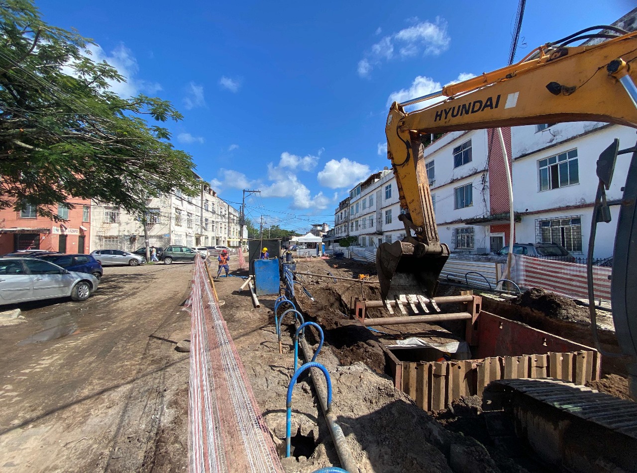 Outra iniciativa importante é a obra de macrodrenagem na Rua Nilo Peçanha (Baixa do Fiscal), no bairro do Uruguai, incluída no escopo do Novo PAC. A proposta visa solucionar os problemas de drenagem nas regiões da Calçada e Alagados III, abrangendo um trecho de 1.279 metros entre a Enseada dos Tainheiros e a Feira do Curtume. A intervenção inclui dragagem, rebaixamento, alargamento e revestimento da calha, substituição de trechos de canal já existentes e desapropriação de edificações que interferem na execução das obras hidráulicas. O investimento estimado é de R$ 53,2 milhões, com início previsto para os próximos meses.