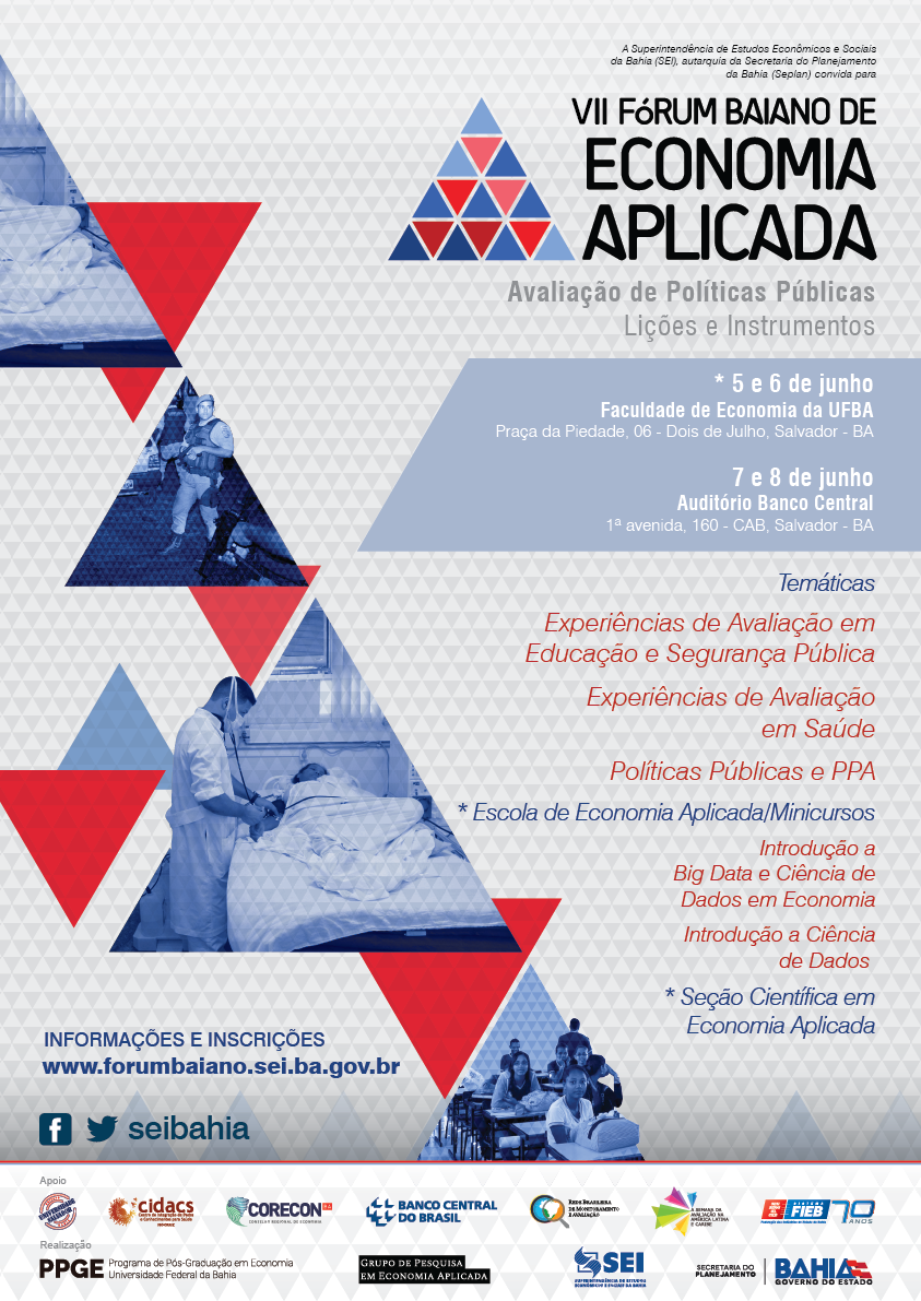 O Fórum Baiano de Economia Aplicada é um evento anual organizado pelo Grupo de Pesquisas em Economia Aplicada e Programa de Pós-Graduação em Economia da UFBA, em parceria com a Superintendência de Estudos Econômicos e Sociais da Bahia (SEI). O Fórum será realizado em parceria com o Núcleo Bahia da Rede Brasileira de Monitoramento e Avaliação (RBMA) no âmbito das atividades da Semana de la Evaluación en América Latina y el Caribe, na cidade de Salvador, entre os dias 5 e 8 de Junho de 2017. Mais informações: http://forumbaiano.sei.ba.gov.br