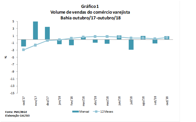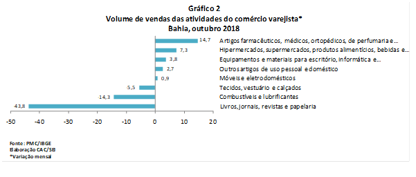 Quanto aos segmentos que mais influenciaram, em outubro, o comportamento positivo das vendas na Bahia tem-se: Hipermercados, supermercados, produtos alimentícios, bebidas e fumo; e Artigos farmacêuticos, médicos, ortopédicos, de perfumaria e cosméticos. Em contrapartida ao comportamento negativo de Combustíveis e lubrificantes.