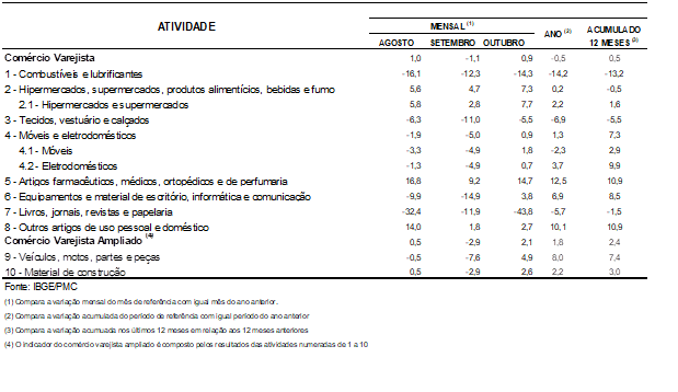 Tabela 1 – Variação do volume de vendas no comércio varejista, por atividade