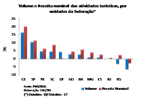 O volume das atividades turísticas, quando comparado com o mesmo mês do ano anterior, avançou 5,4% no Brasil. Esse resultado foi impulsionado, principalmente, pelas variações positivas de Ceará (16,4%), São Paulo (10,5%), Pernambuco (4,7%), Santa Catarina (4,5%), Distrito Federal (4,4%), Goiás (2,9%) e Bahia (2,7%). Em contrapartida, apenas o Paraná (-6,4%) e Rio Grande do Sul (-3,1%) retraíram no período.