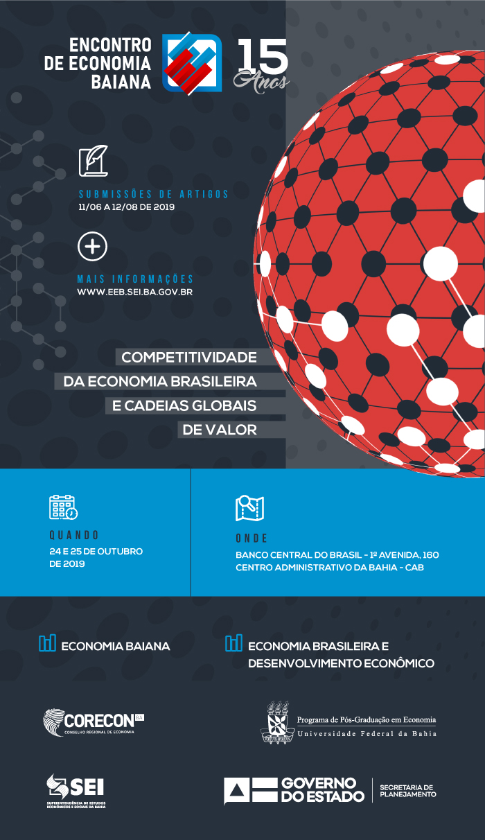 Abordando o tema Competitividade da economia brasileira e cadeias globais de valor, o XV Encontro de Economia Baiana fomentará debates e discussões sobre a construção de uma visão de futuro para a Bahia e o Brasil, identificando os desafios e soluções para o desenvolvimento. O evento reunirá pesquisadores, estudantes e profissionais da Economia de todo o país para discutir temas relacionados às novas tendências e oportunidades de negócios, bem como analises referentes à superação dos enclaves ao desenvolvimento da Bahia, bem como para traçar novas propostas sobre desenvolvimento econômico do estado e do Nordeste.