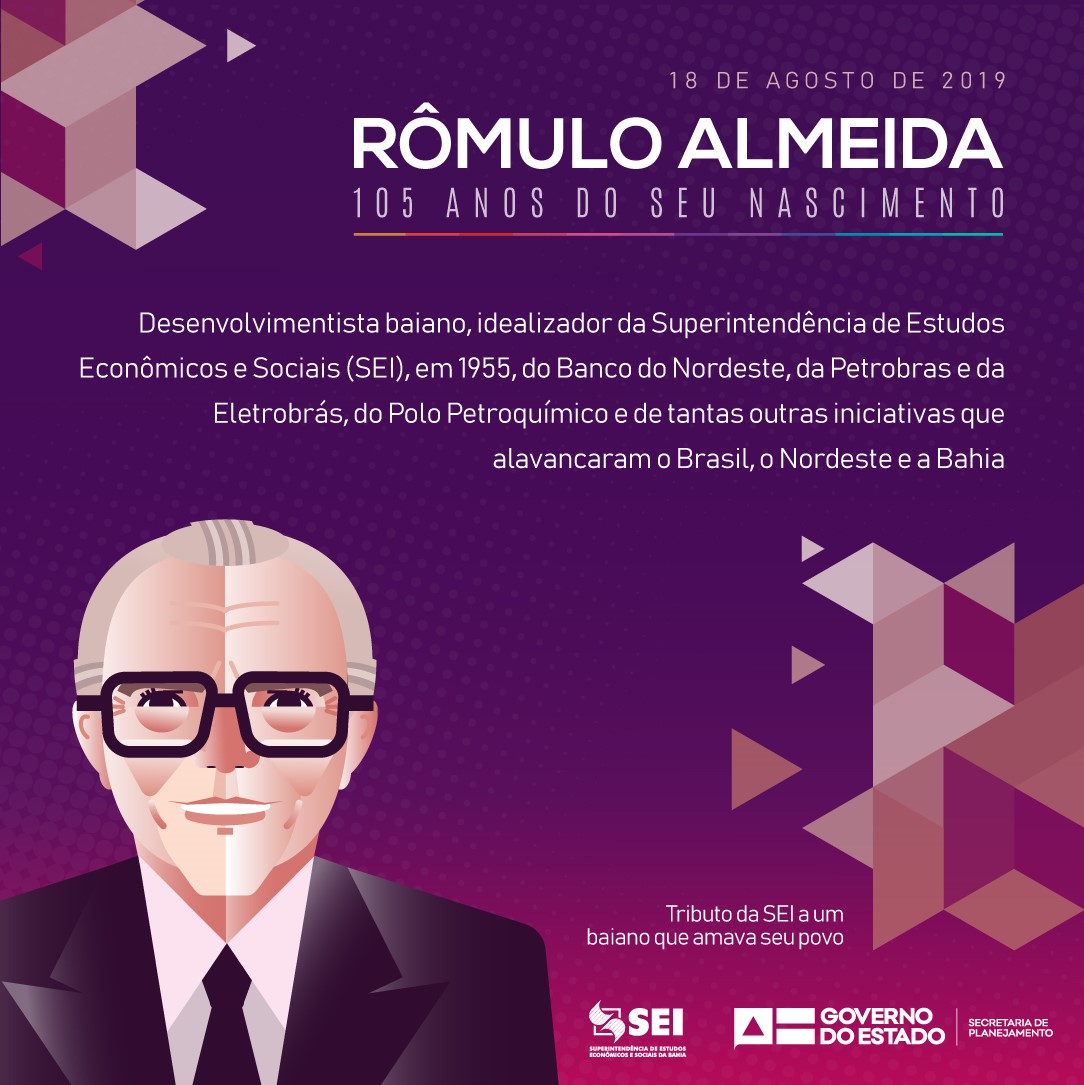A Superintendência de Estudos Econômicos e Sociais da Bahia presta uma homenagem ao economista Rômulo Almeida, por ocasião dos 105 anos de seu nascimento, no próximo domingo. Rômulo nasceu no dia 18 de agosto de 1914, em Salvador, e morreu em 25 de novembro de 1988, em Belo Horizonte. Ao longo de sua extensa carreira como economista, ele atuou em diversos campos e foi responsável por inúmeros projetos, que tiveram reflexo profundo nas vidas de todos os brasileiros. Entre esses projetos estão a idealização da Superintendência de Estudos Econômicos e Sociais da Bahia, Banco do Nordeste, Petrobras, Eletrobras, Polo Petroquímico e tantas outras iniciativas que alavancaram o Brasil, o Nordeste e a Bahia.