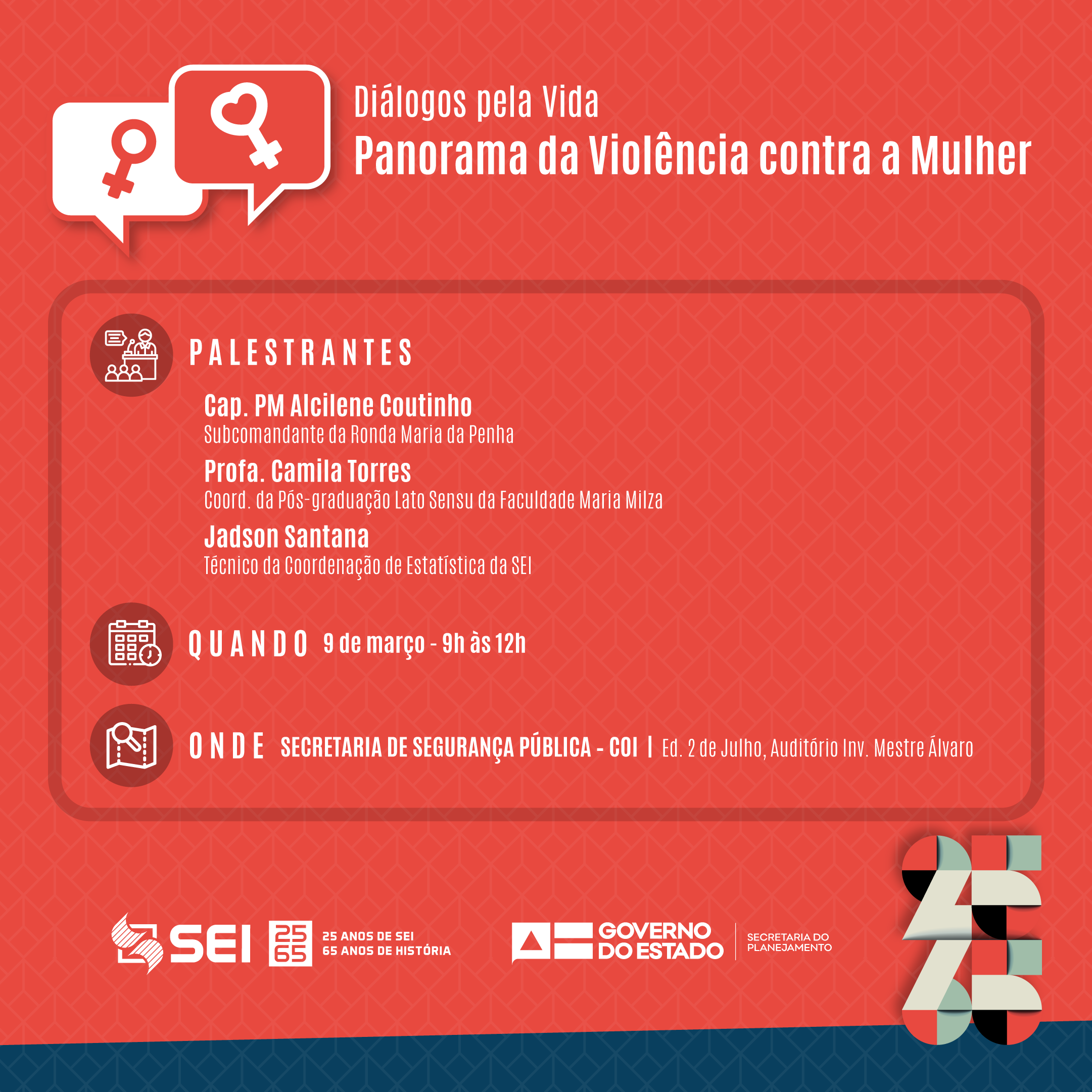 O evento ocorrerá no dia 09 de Março de 2020, às 9h, na Secretaria de Segurança Pública (SSP) / COI, Edf. 2 de Julho, no Auditório Investigador Mestre Álvaro.