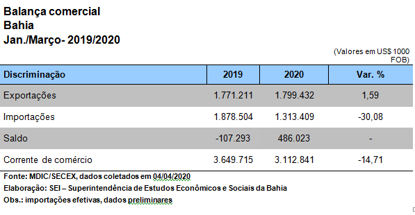 As importações, entretanto, foram duramente atingidas, alcançando US$ 444,9 milhões, com queda de 34,6% e que atingiu de forma generalizada todas as categorias de uso. O recuo reflete não somente a desvalorização cambial como também o impacto inicial da covid-19 na demanda doméstica e os efeitos da pandemia no fluxo logístico e de abastecimento, principalmente de bens “made in China”, terceiro maior fornecedor de produtos ao estado. As informações foram analisadas pela Superintendência de Estudos Econômicos e Sociais da Bahia (SEI), autarquia vinculada à Secretaria de Planejamento (Seplan).