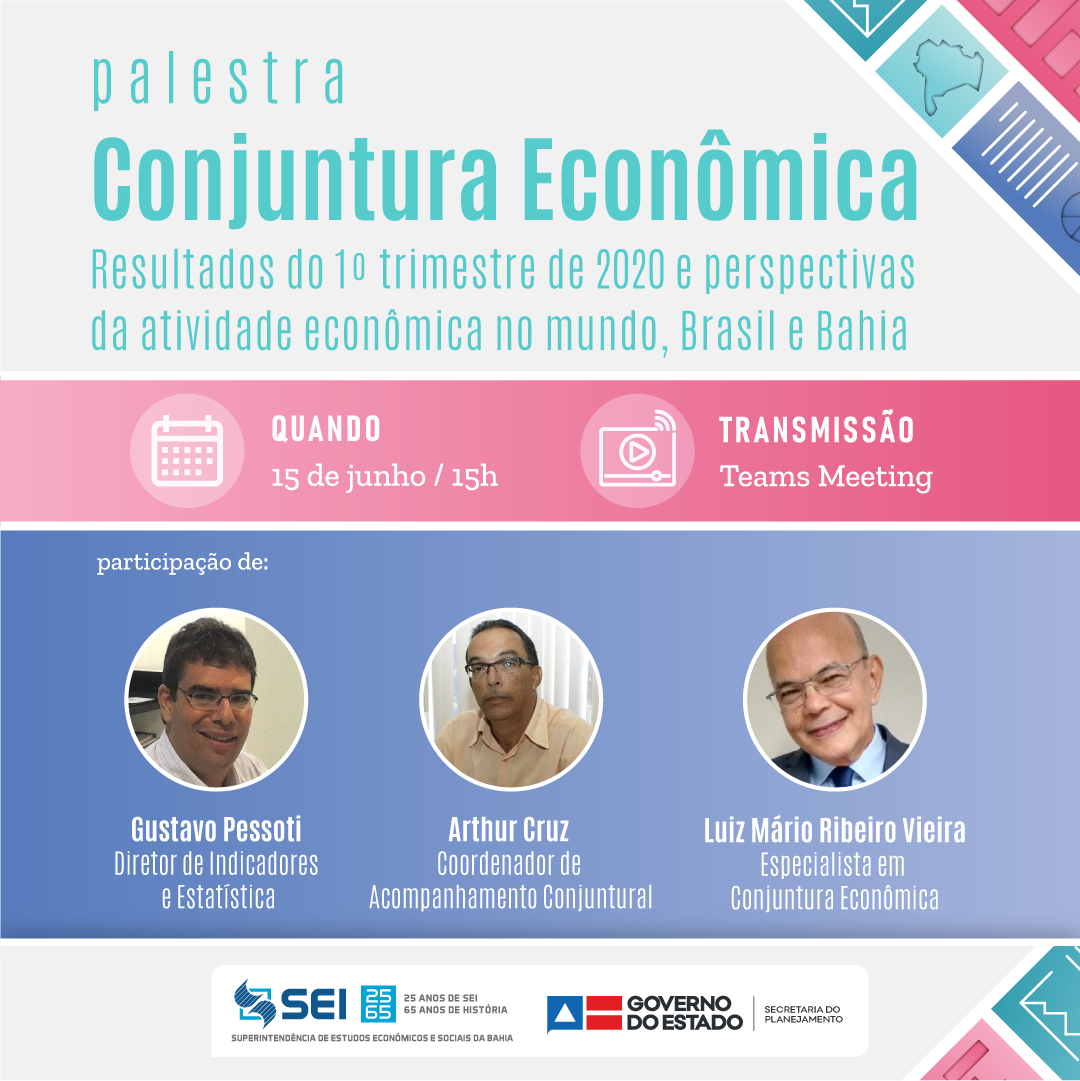 Na próxima segunda-feira (15), às 15h ocorrerá a primeira palestra on-line de Conjuntura Econômica, realizada pela Superintendência de Estudos Econômicos e Sociais da Bahia (SEI), através da plataforma Teams Meeting.
