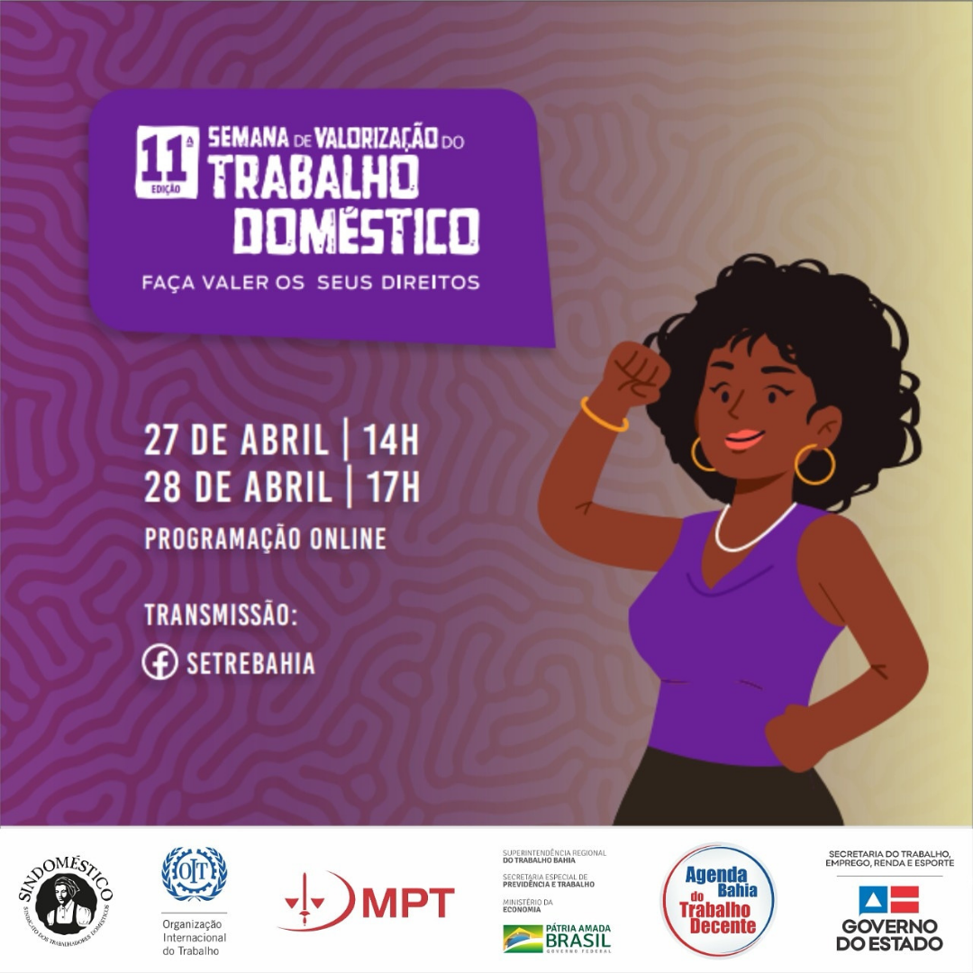 A 11ª Semana de Valorização do Trabalho Doméstico acontece nesta terça e quarta-feira (27 e 28 de abril), de forma virtual, com uma programação composta por painel temático, roda de conversa e apresentações de estudos e projetos. O evento é uma realização da Secretaria do Trabalho, Emprego, Renda e Esporte (Setre) e marca as comemorações do Dia Nacional da Trabalhadora e do Trabalhador Doméstico, celebrado em 27 de abril.